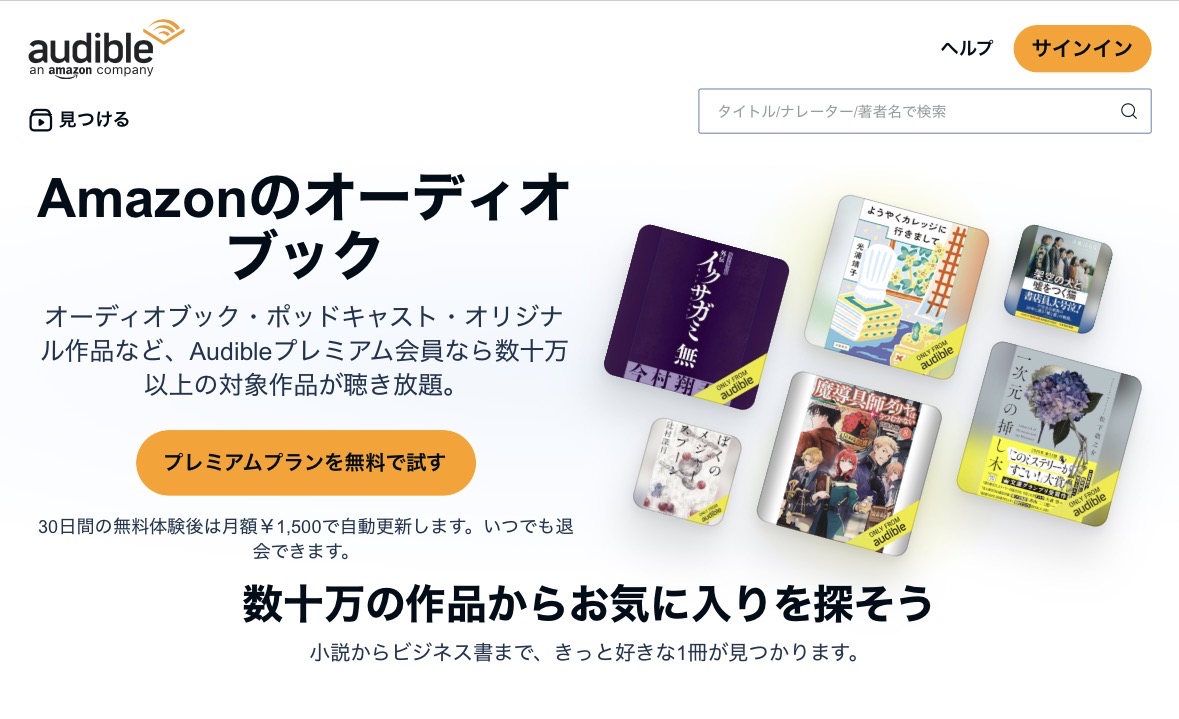 オーディブルでは月額1500円でなんと数十万冊以上の本が聴き放題です。