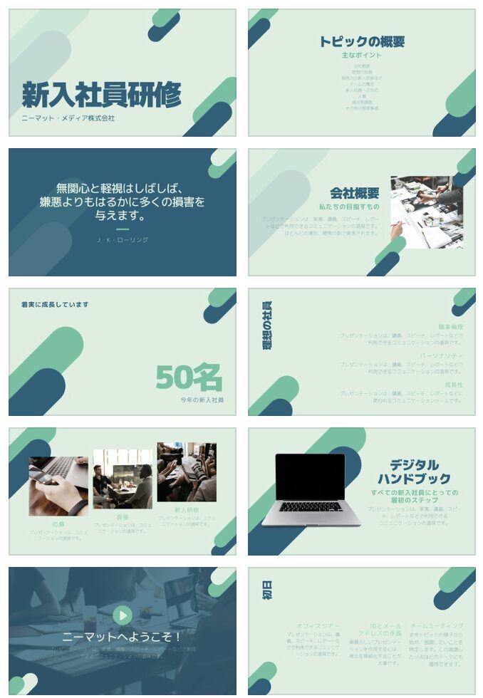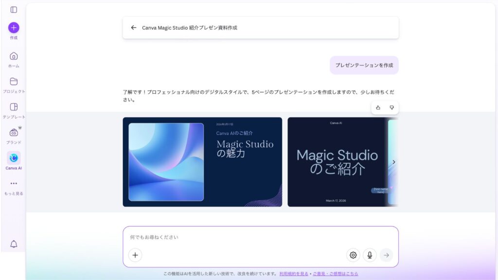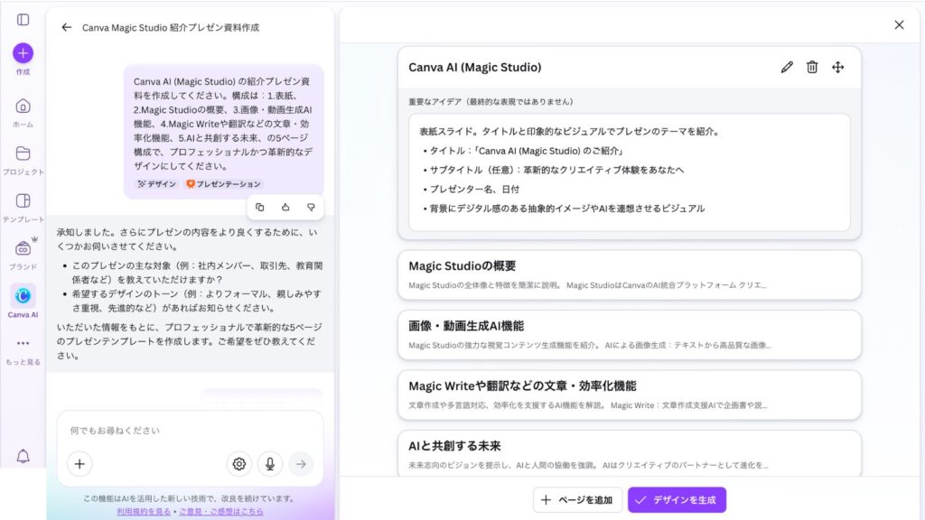 このプロンプトで実際にCanvaAIが、わずか数分で、作成してくれたプレゼン資料がこちら。