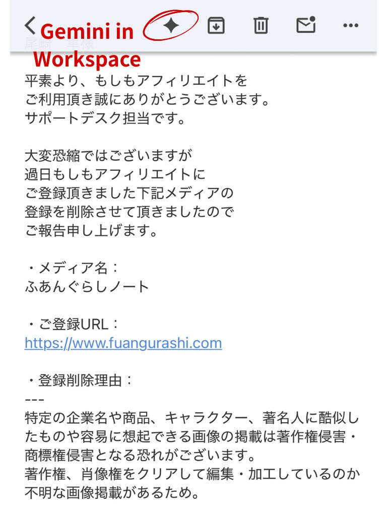 ちなみにこのメールは、このブログを立ち上げたばかりの頃、ルールを知らなすぎて「もしもアフィリエイト」から登録解除通知がきた時のメールです。