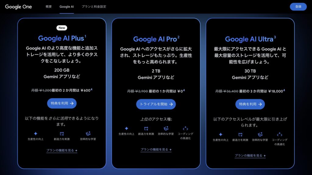 Geminiではプランごとに無料体験ができます。