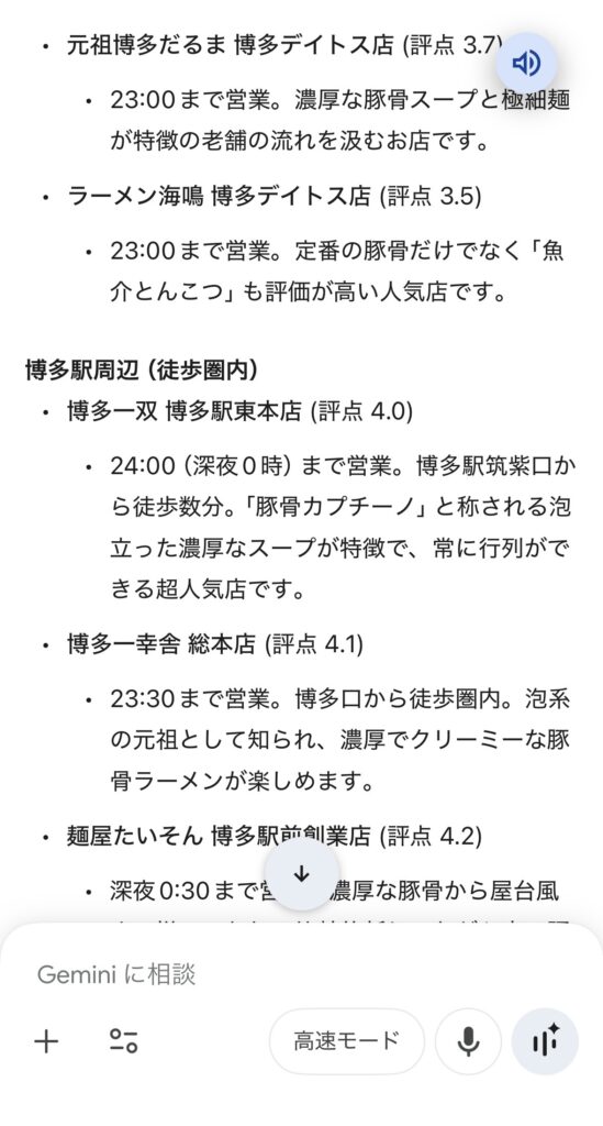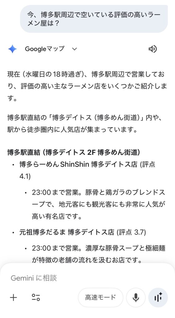 「今、この近くで開いている評価の高いお店は?」といった、営業時間の変更や混雑状況を含む「今この瞬間の街の情報」を正確に答えることができます。